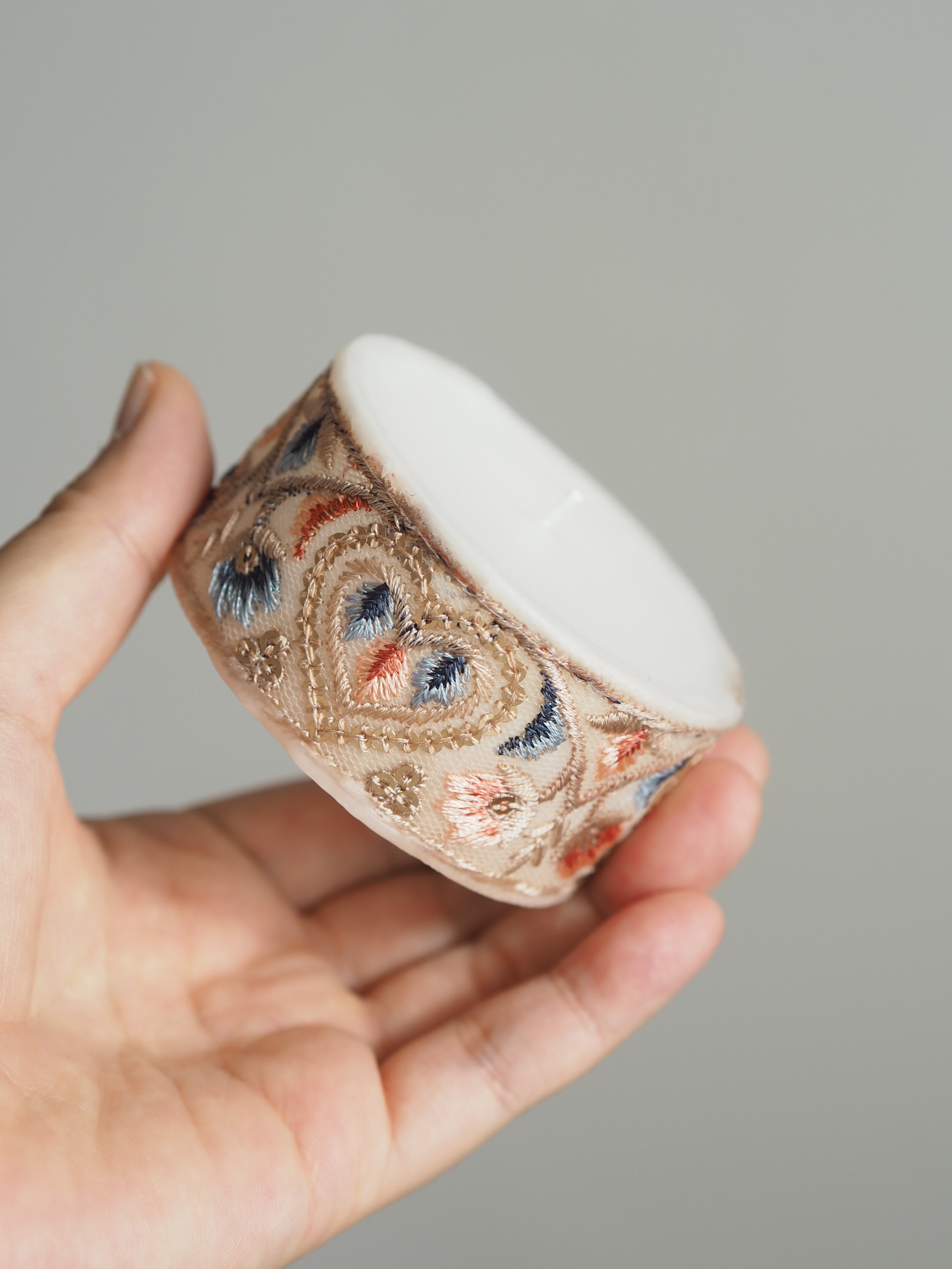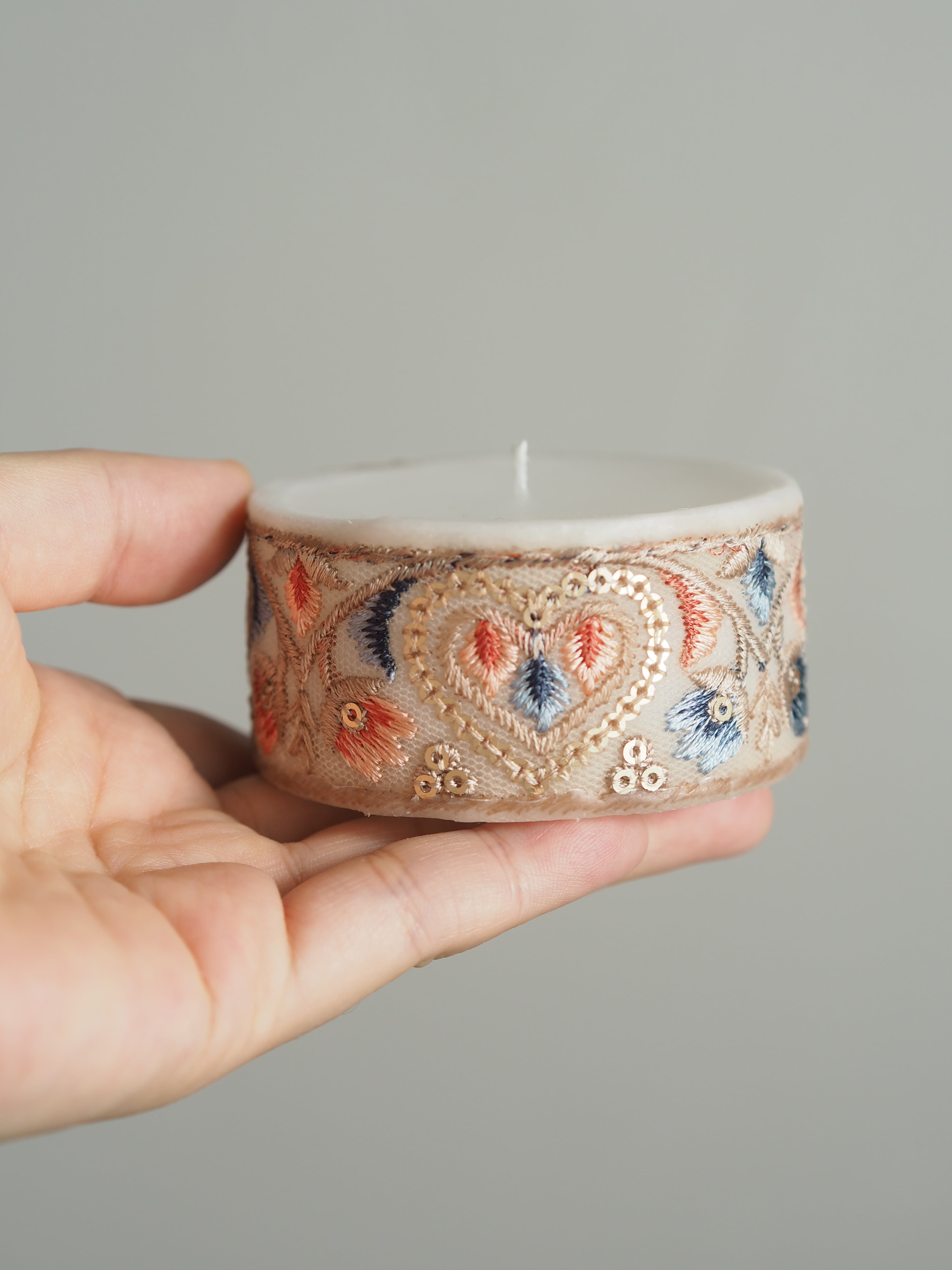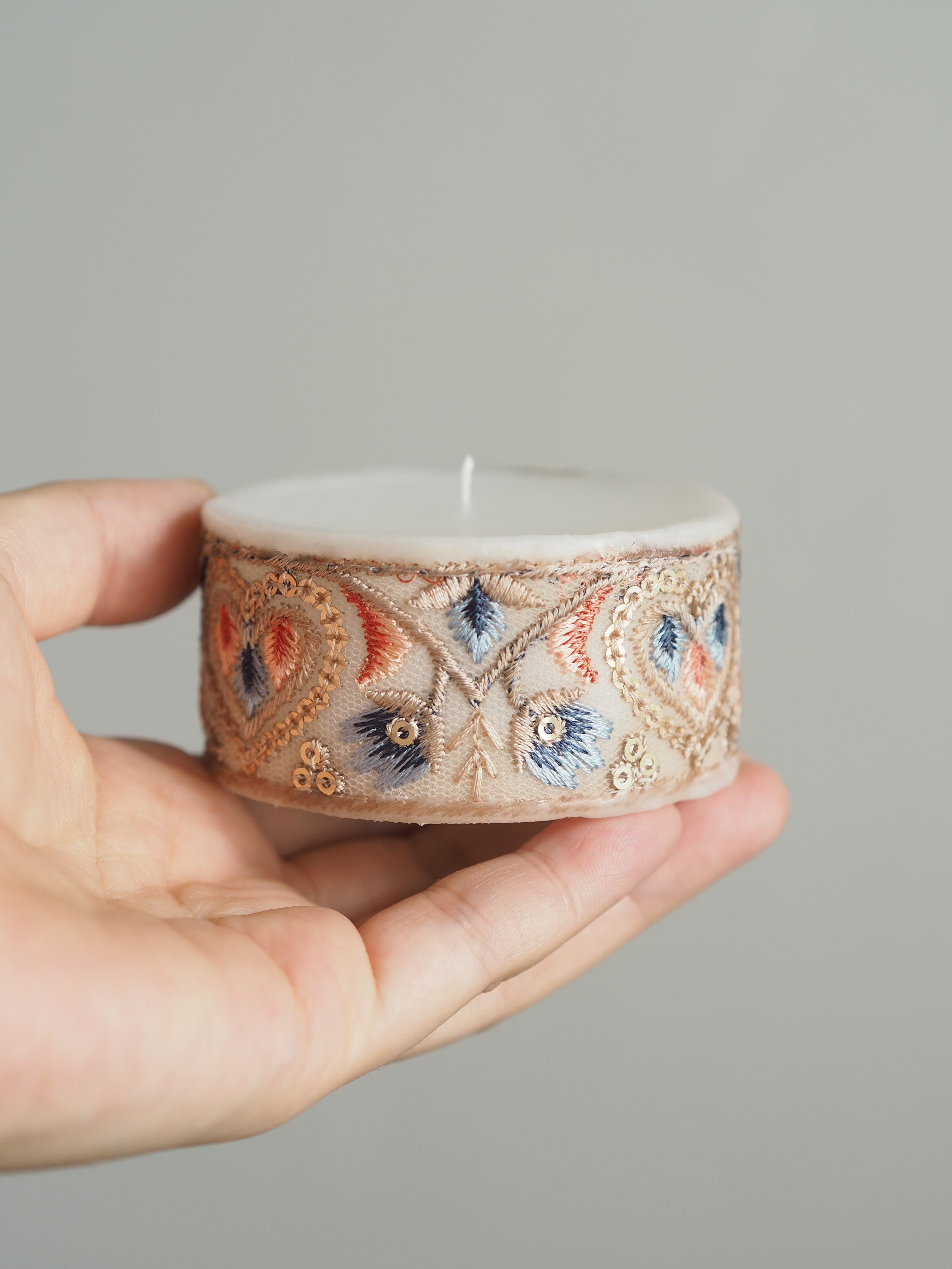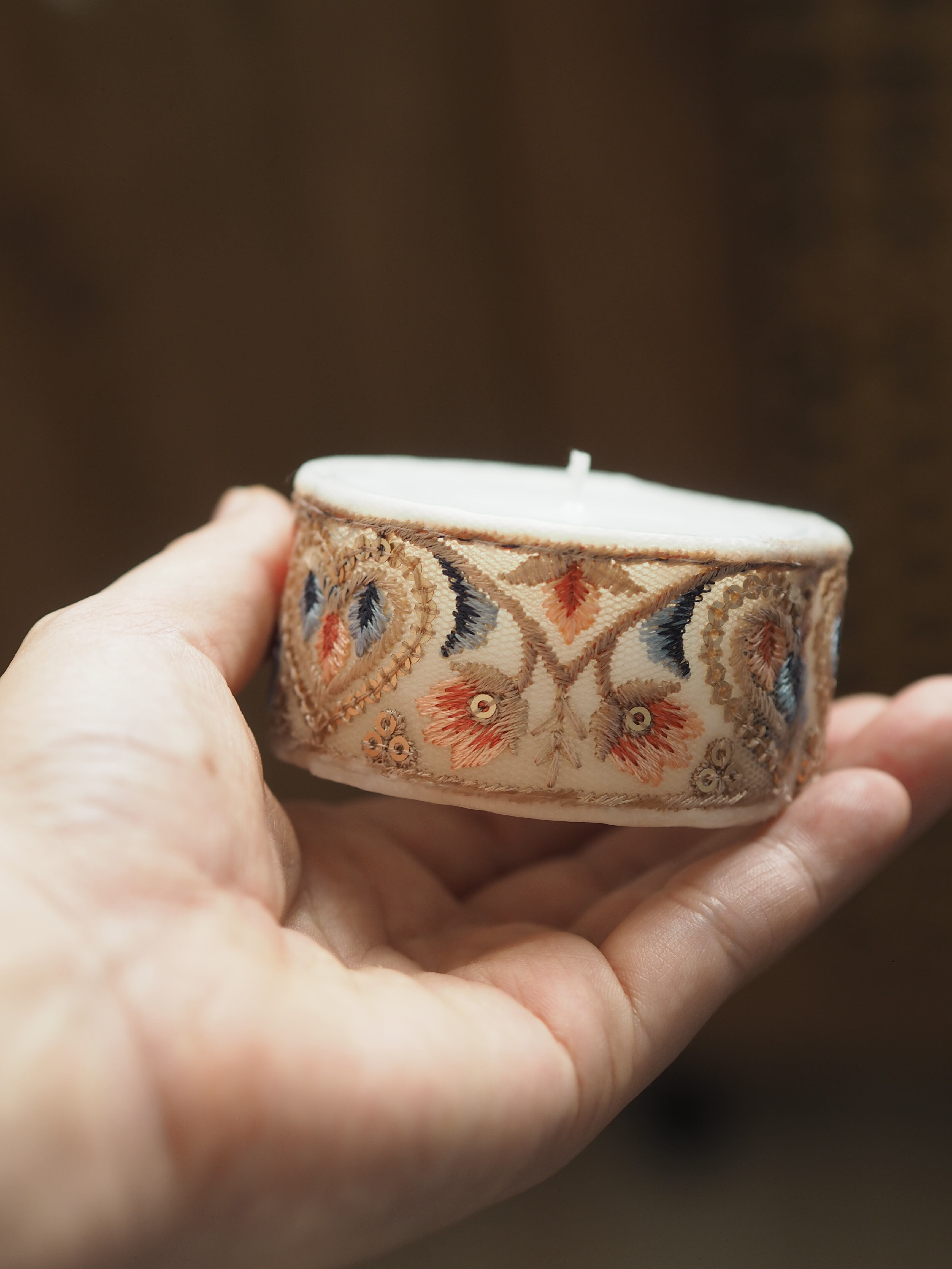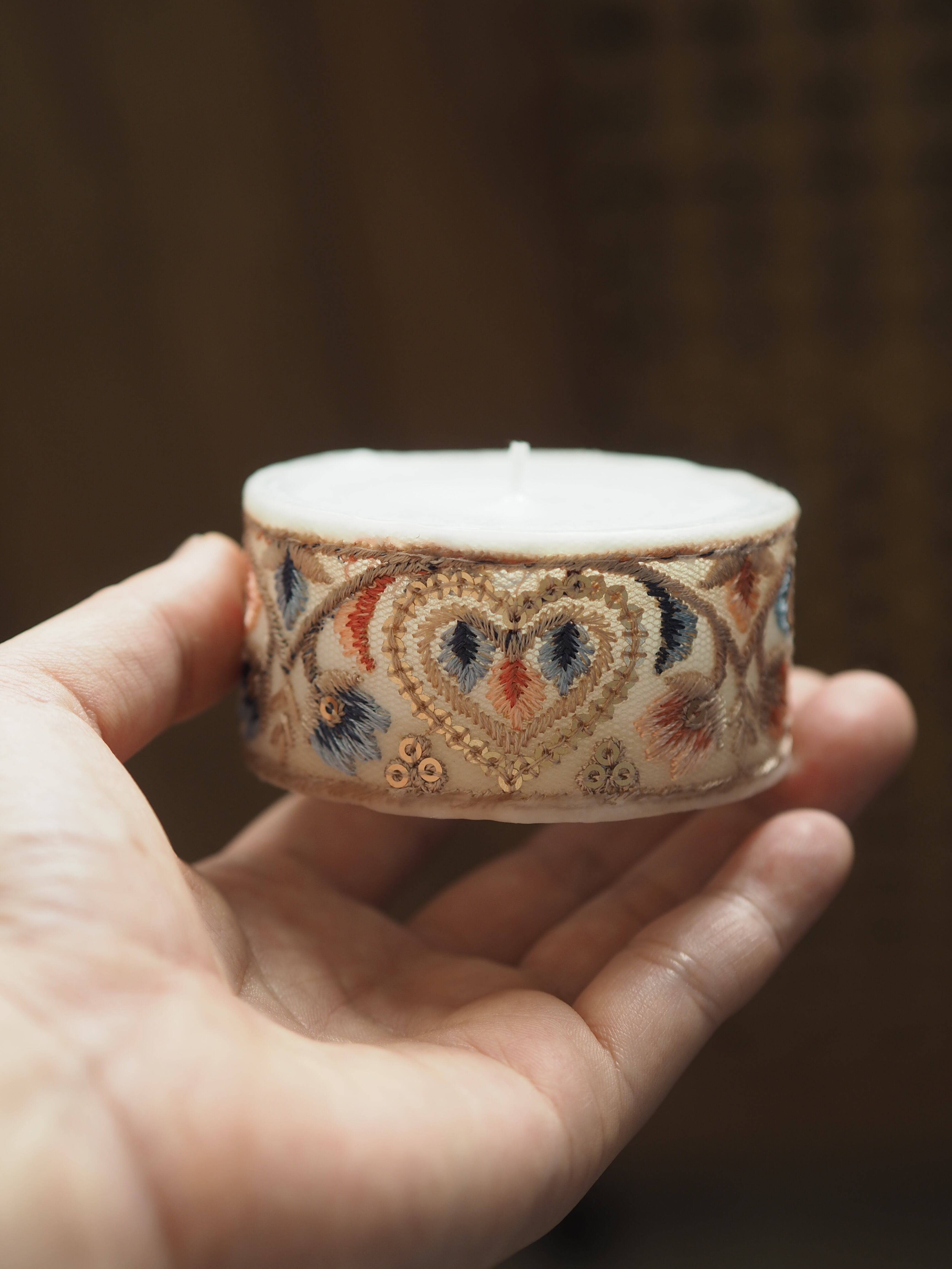 手のひらサイズのコロンとしたフォルムに、存在感のあるインド刺繍リボンをあしらったキャンドル。