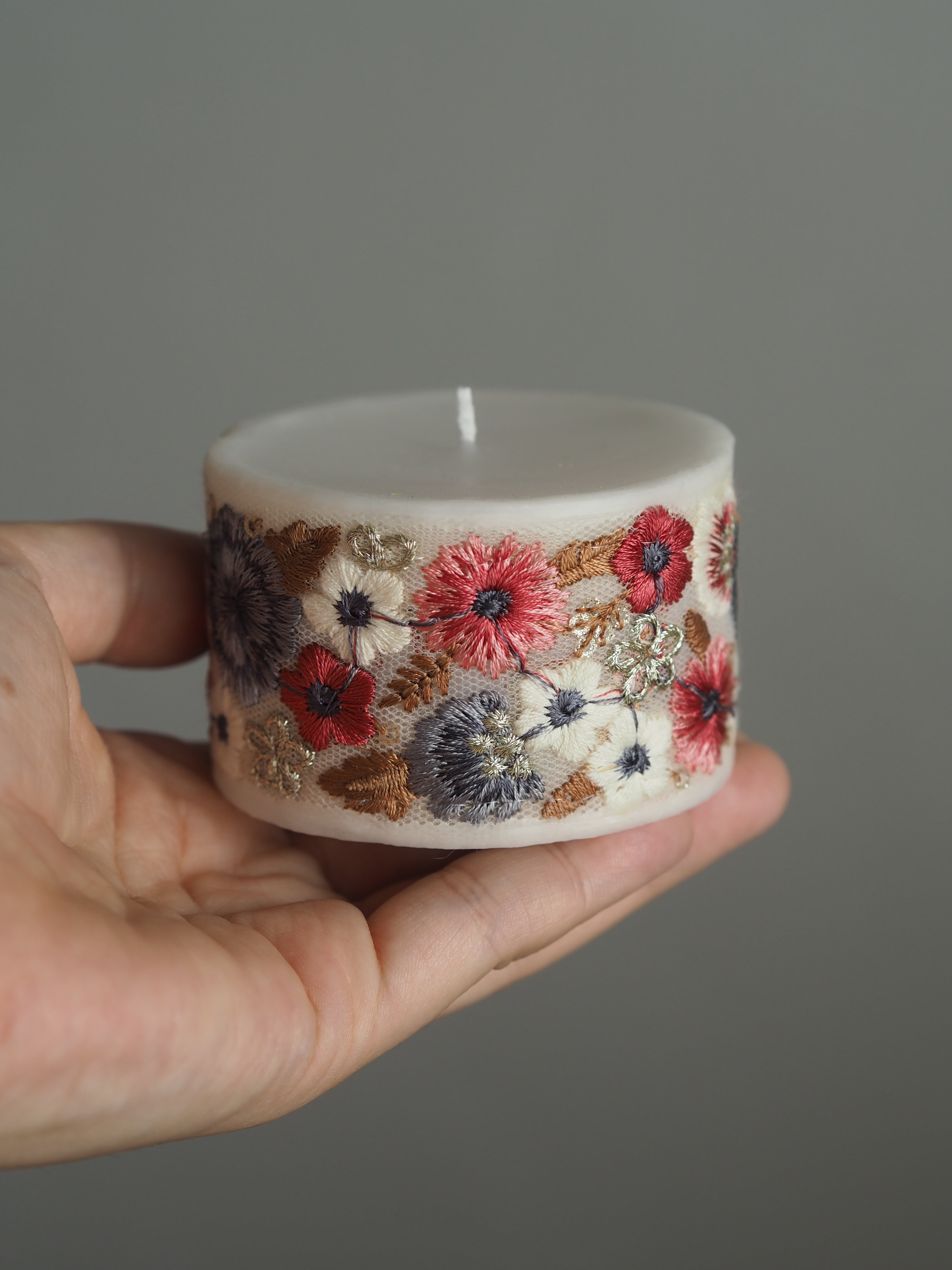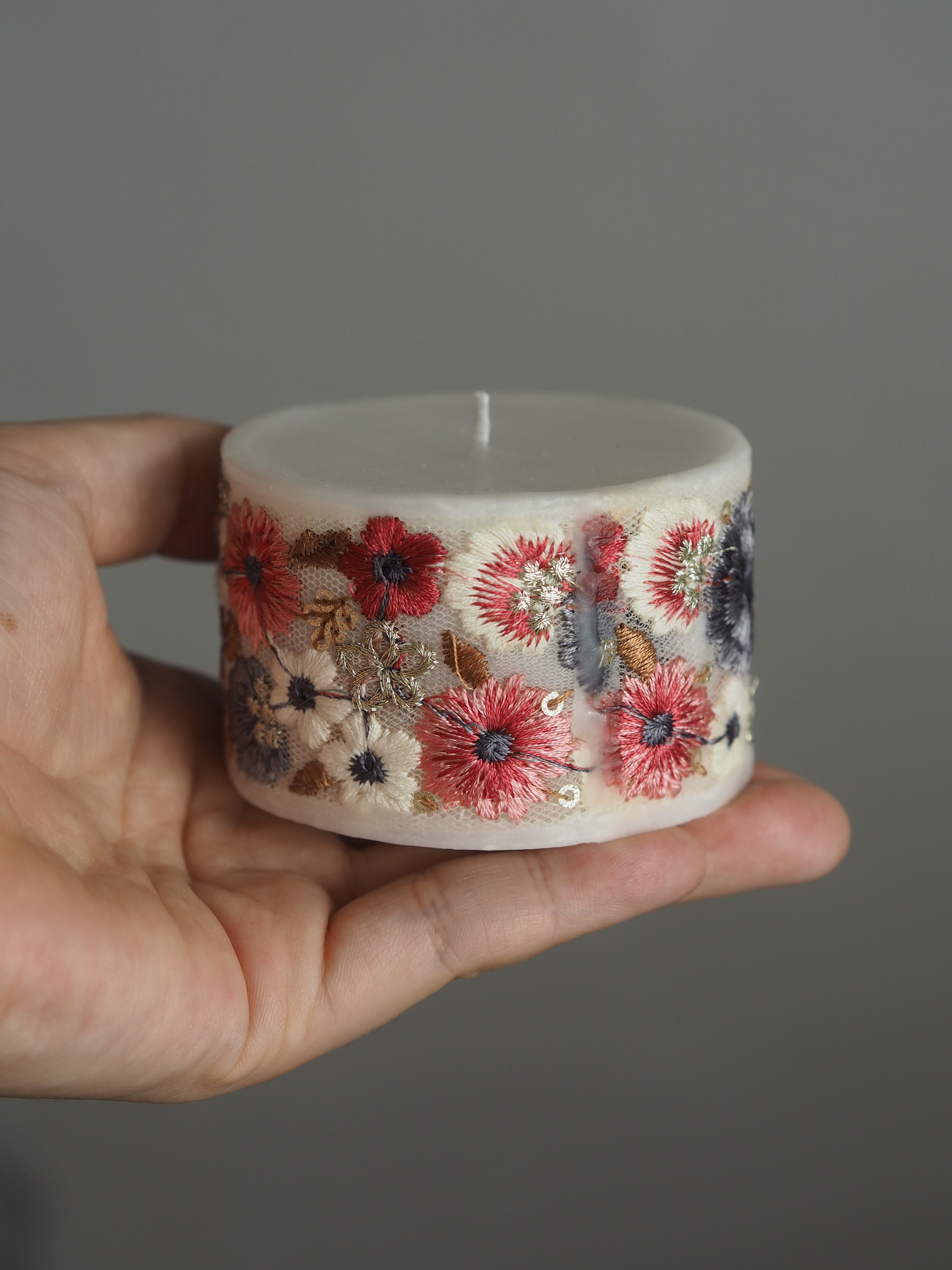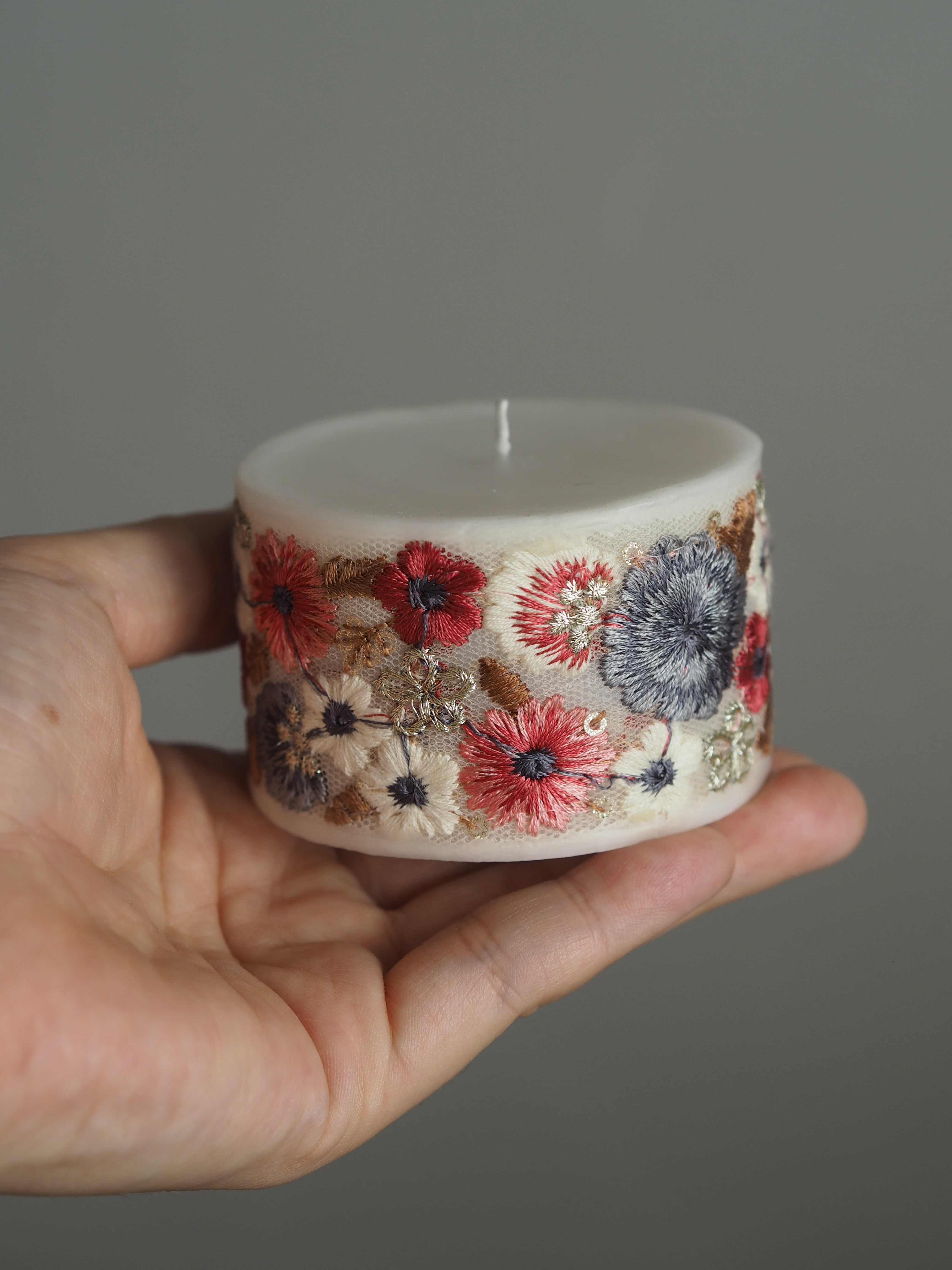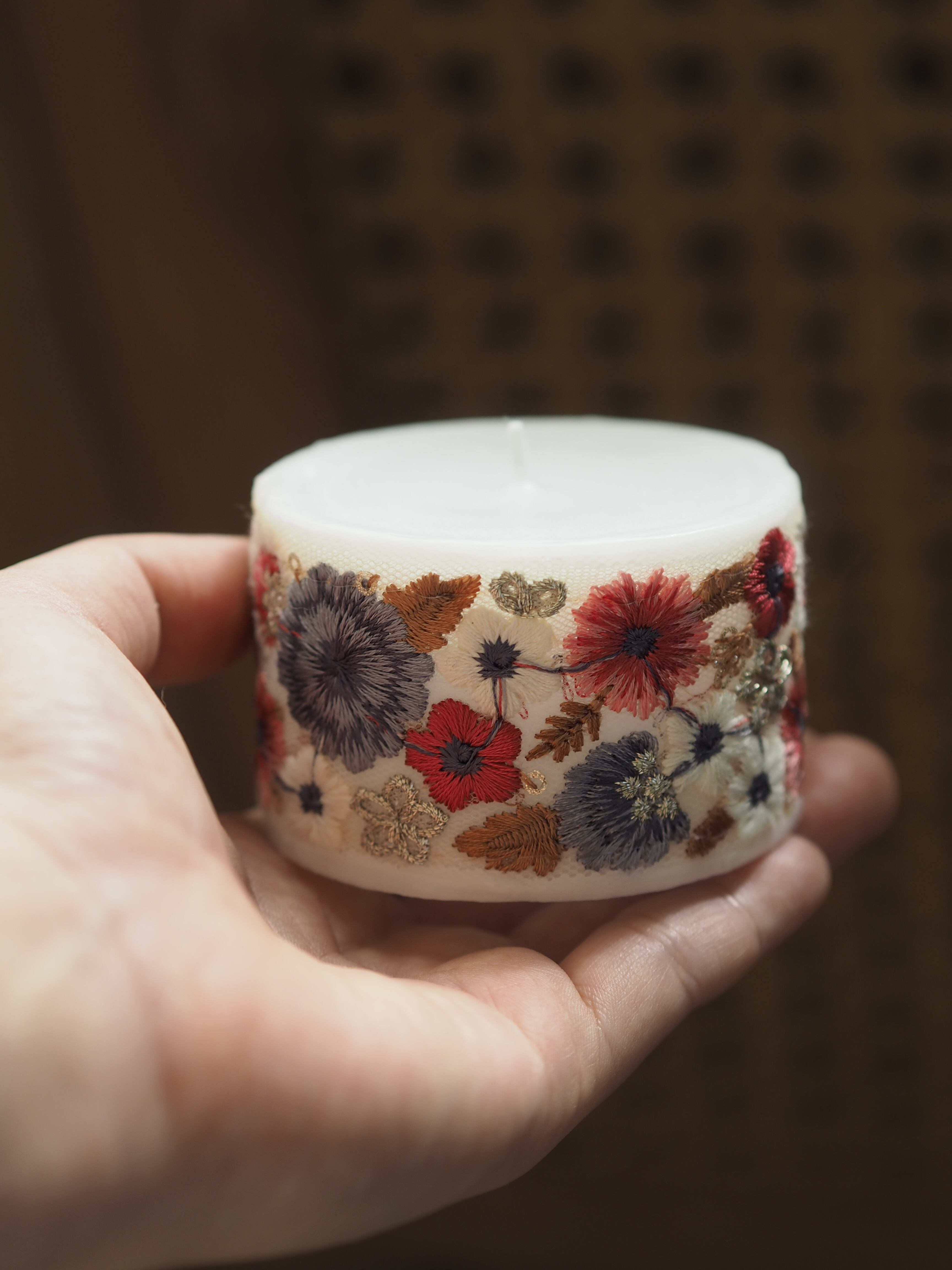 手のひらサイズのコロンとしたフォルムに、存在感のあるインド刺繍リボンをあしらったキャンドル。