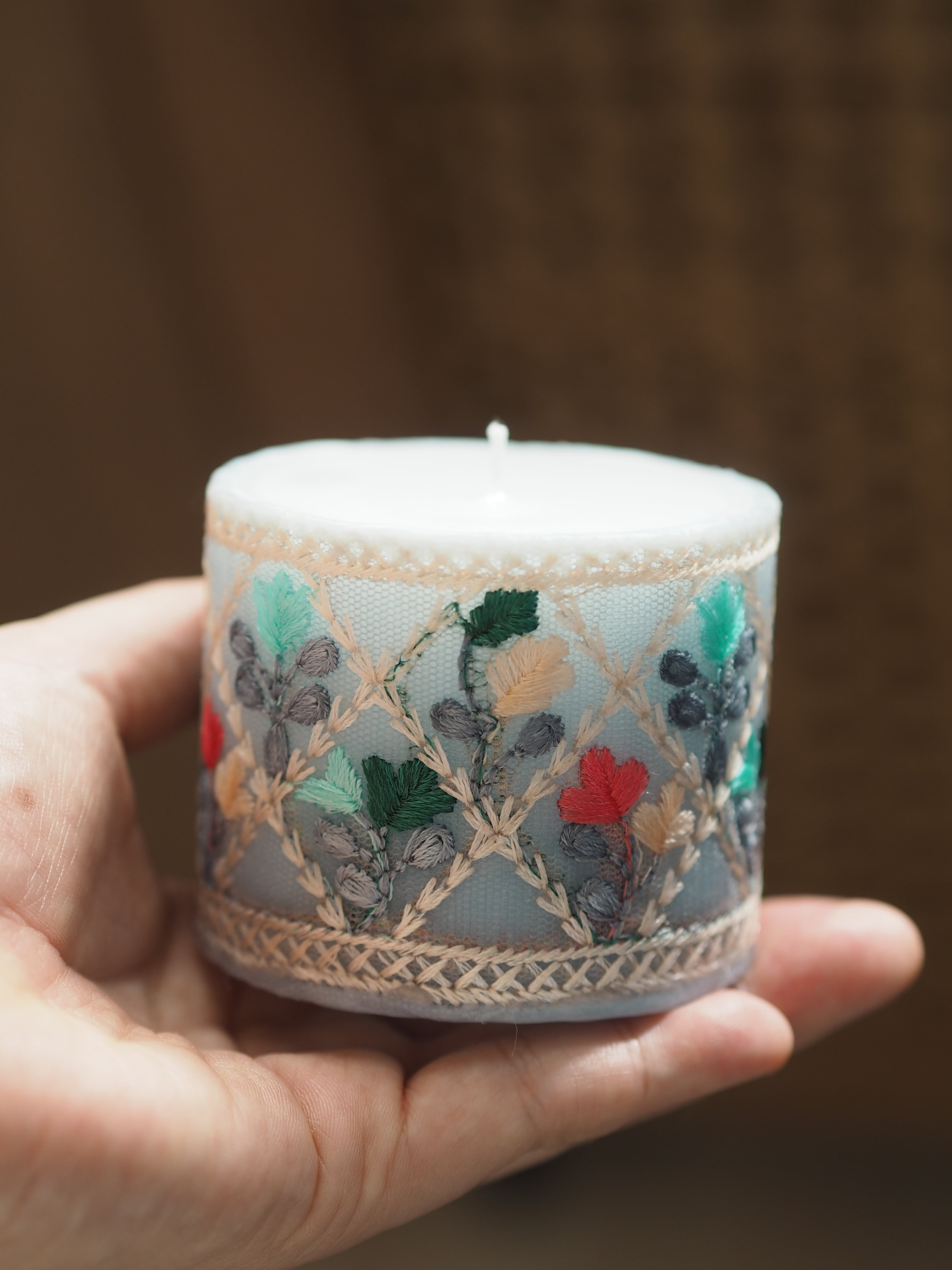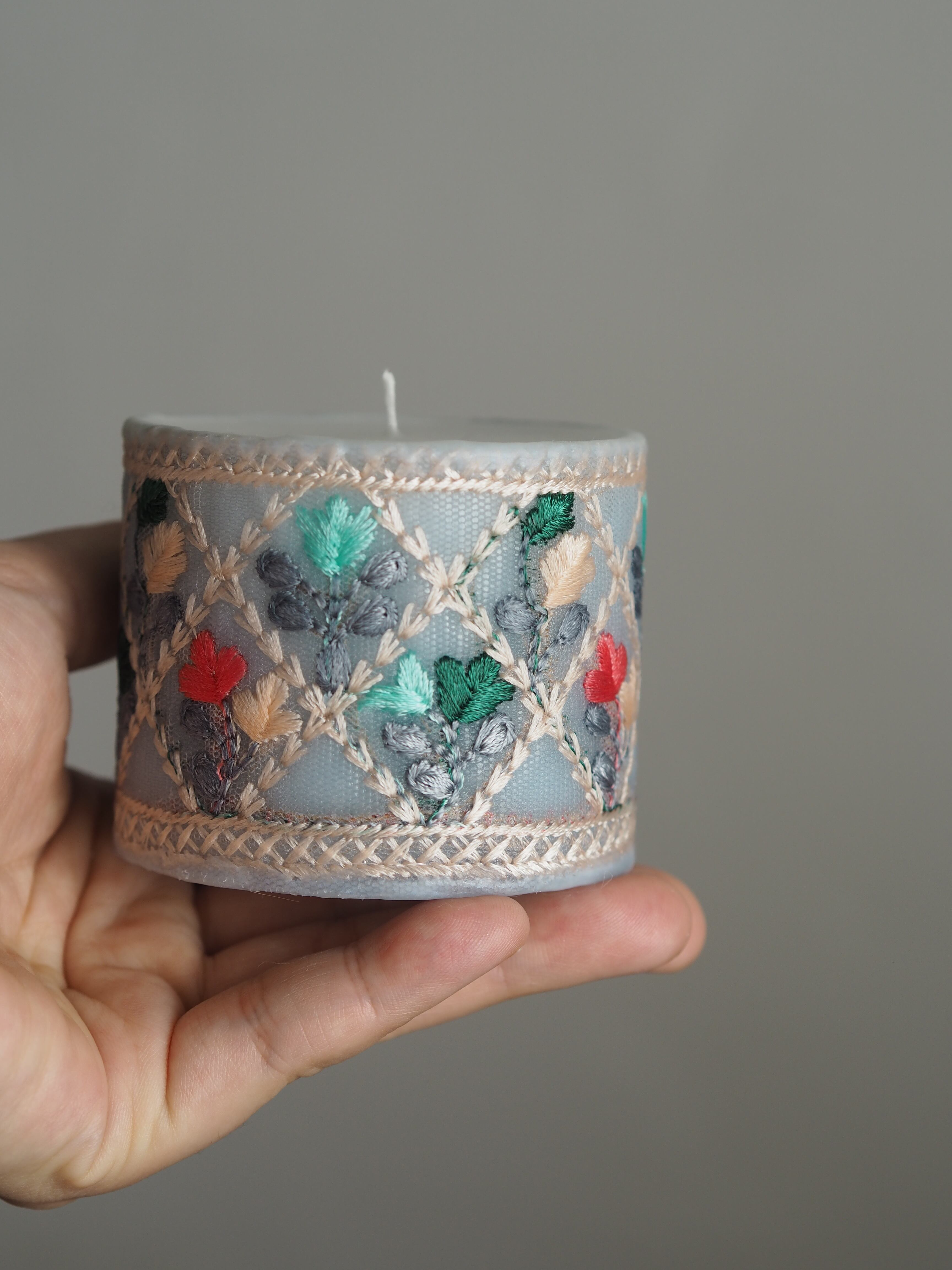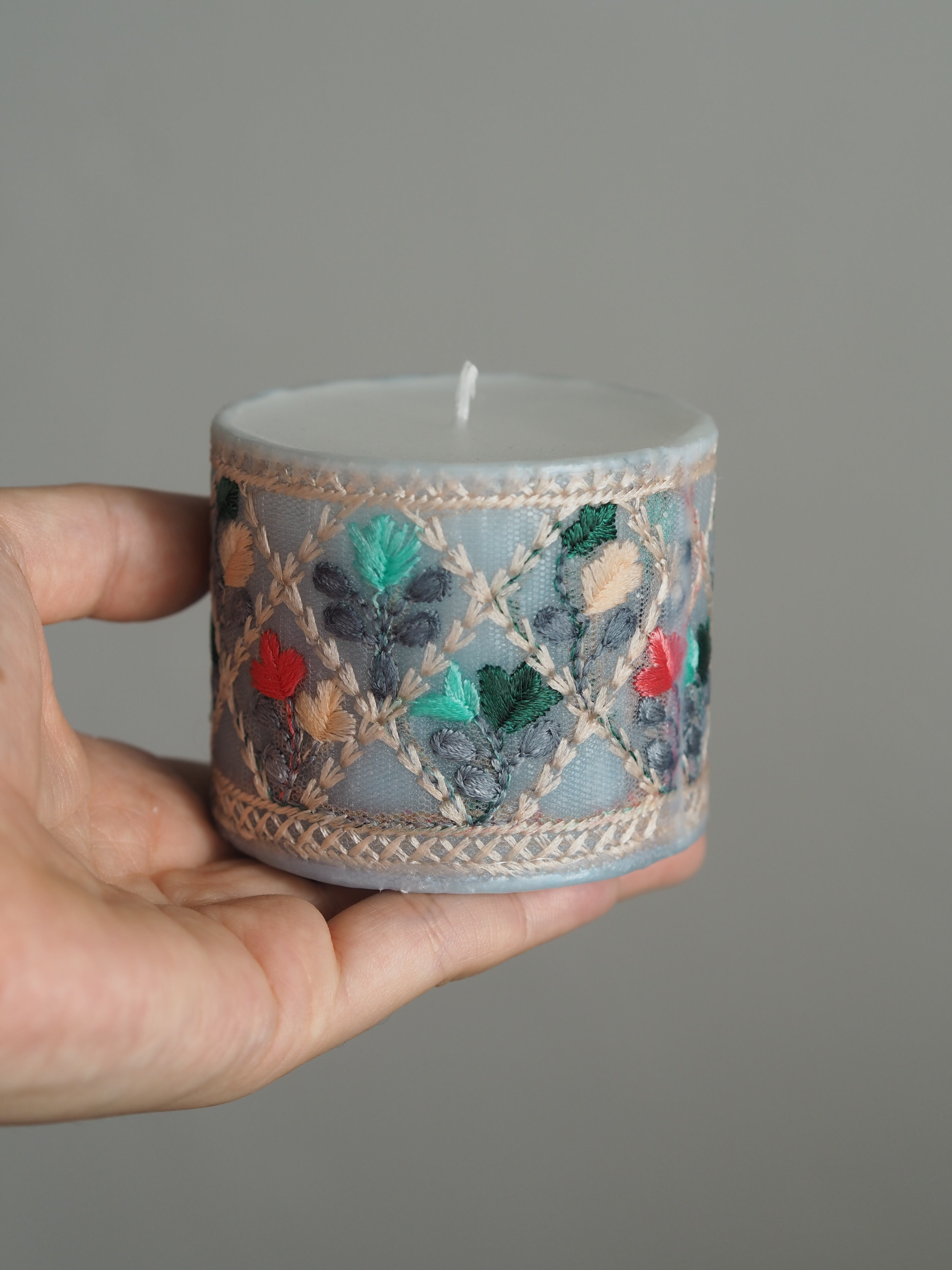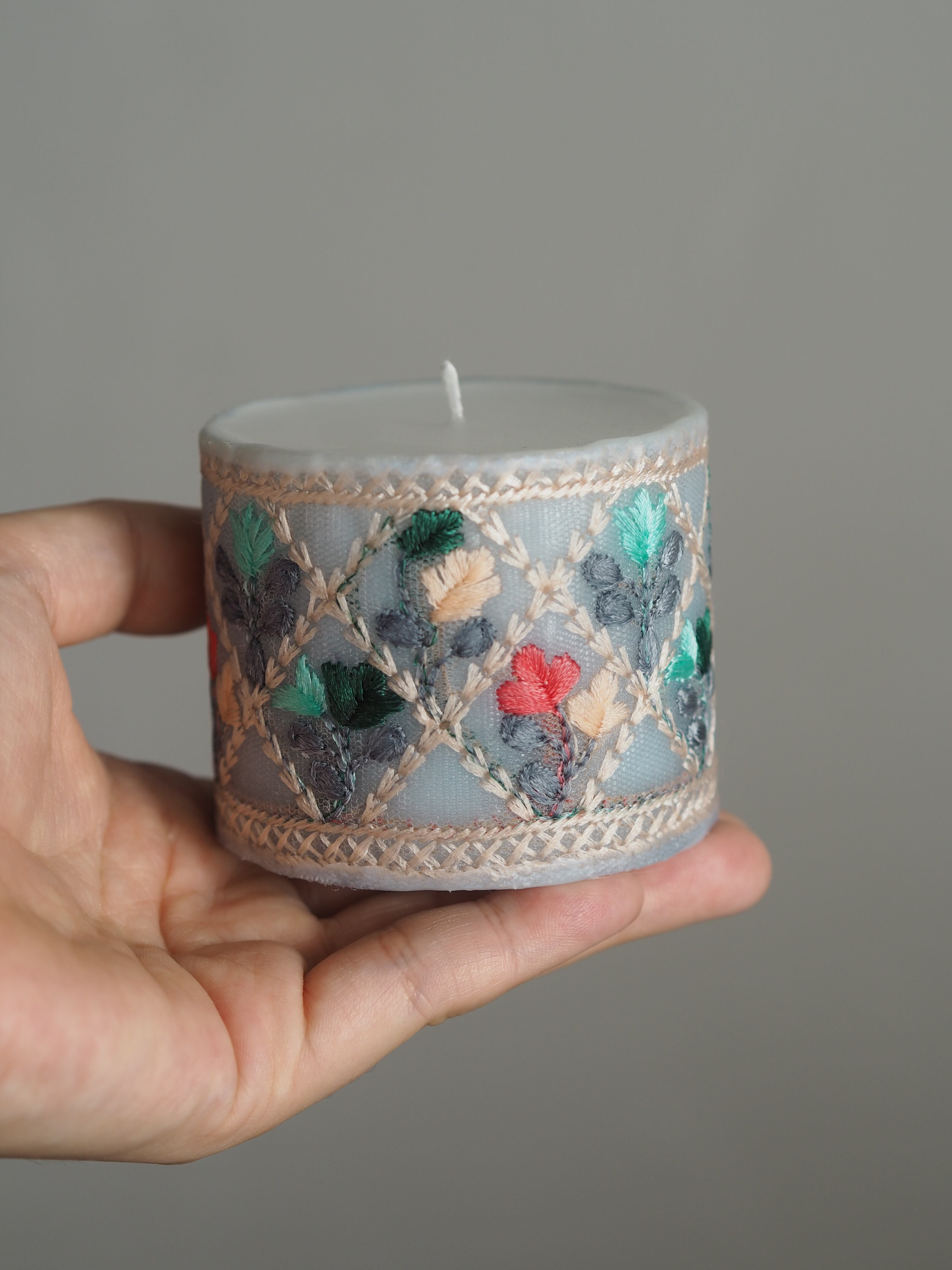 落ち着いたブルーグレー地に、カラフルな花や葉っぱが刺繍されたリボンを巻いたキャンドル。
