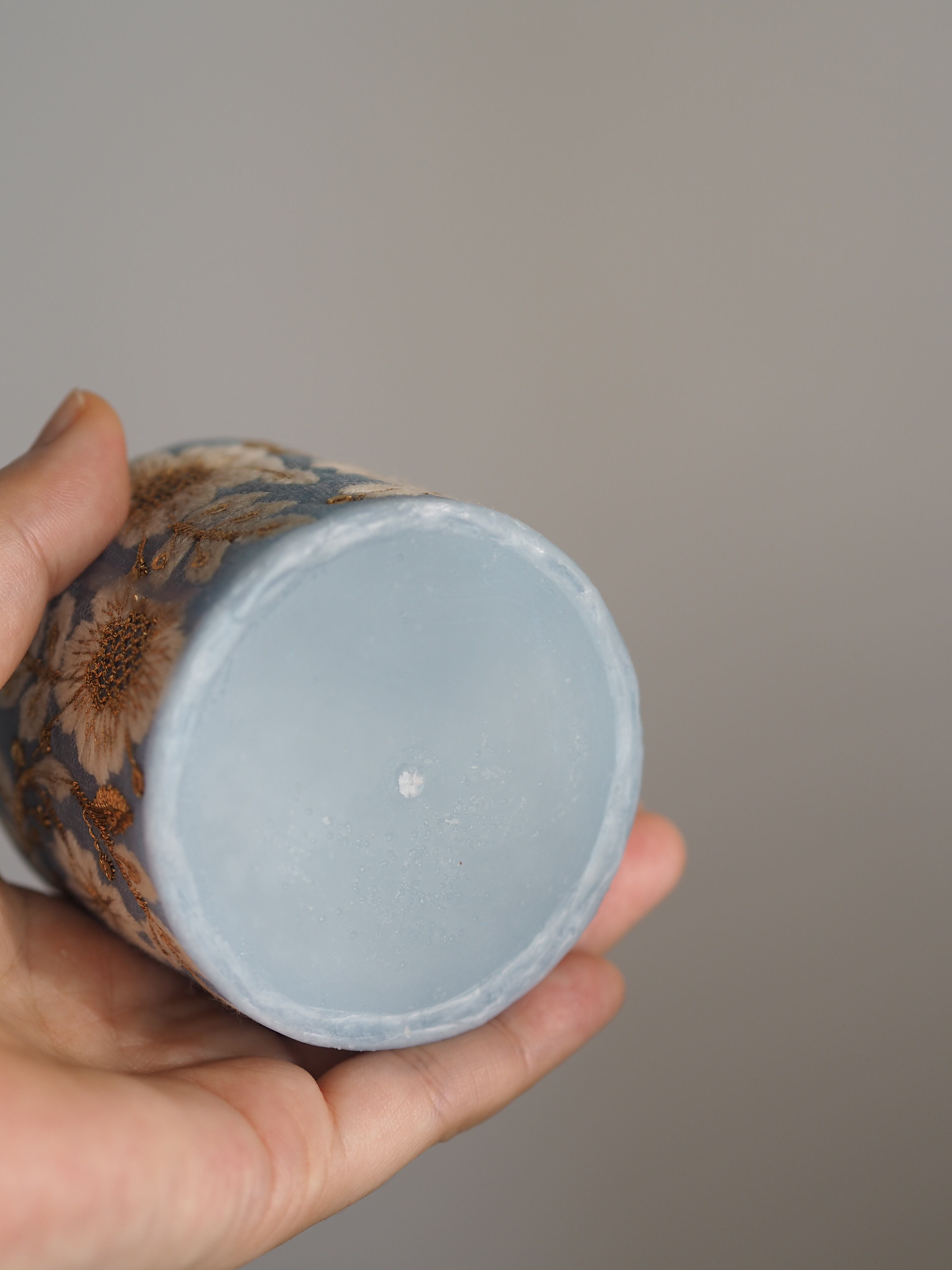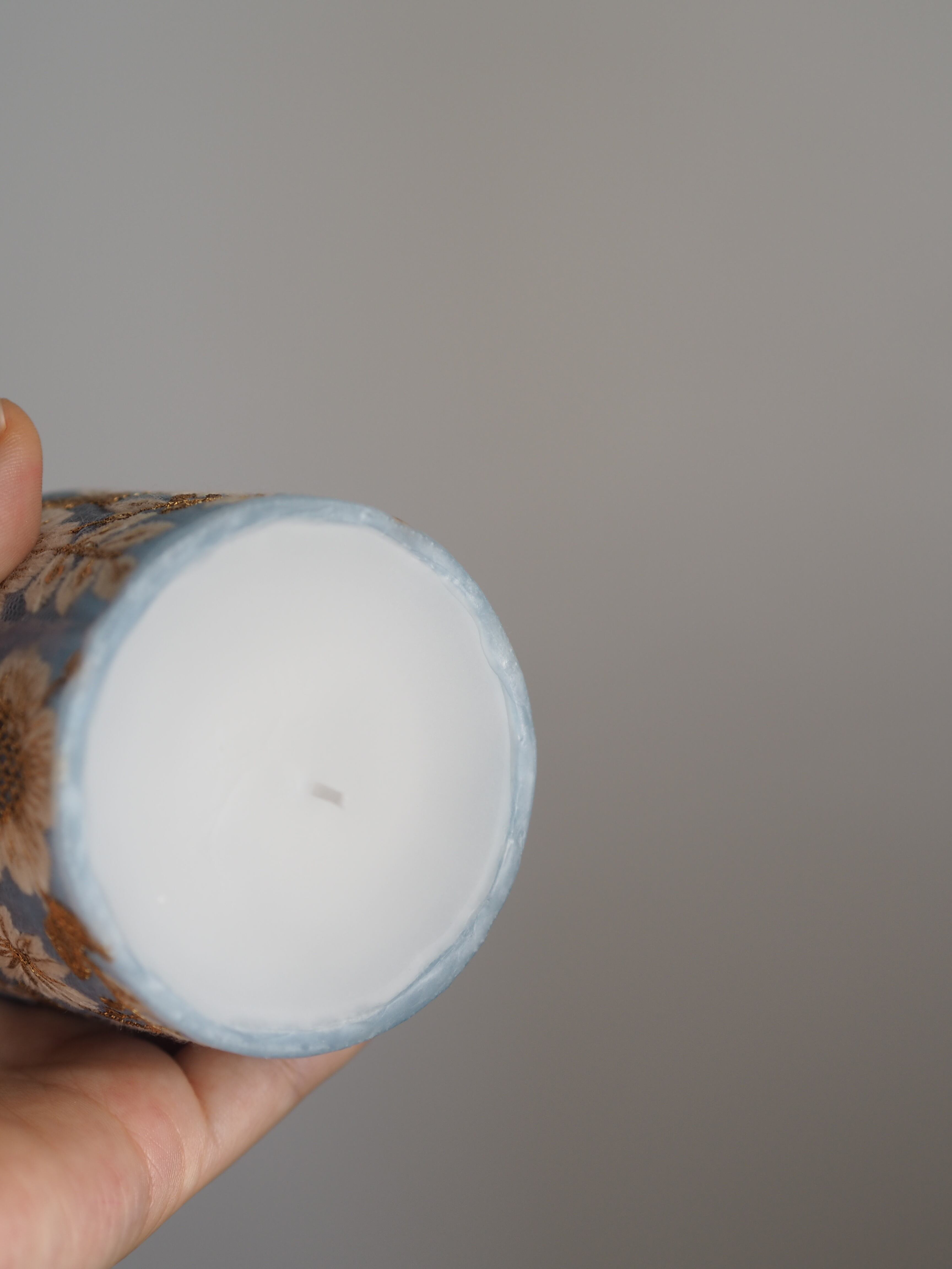 淡いブルーにゴールド×ホワイトの花刺繍が咲き誇る、華やかなインド刺繍リボンキャンドル。